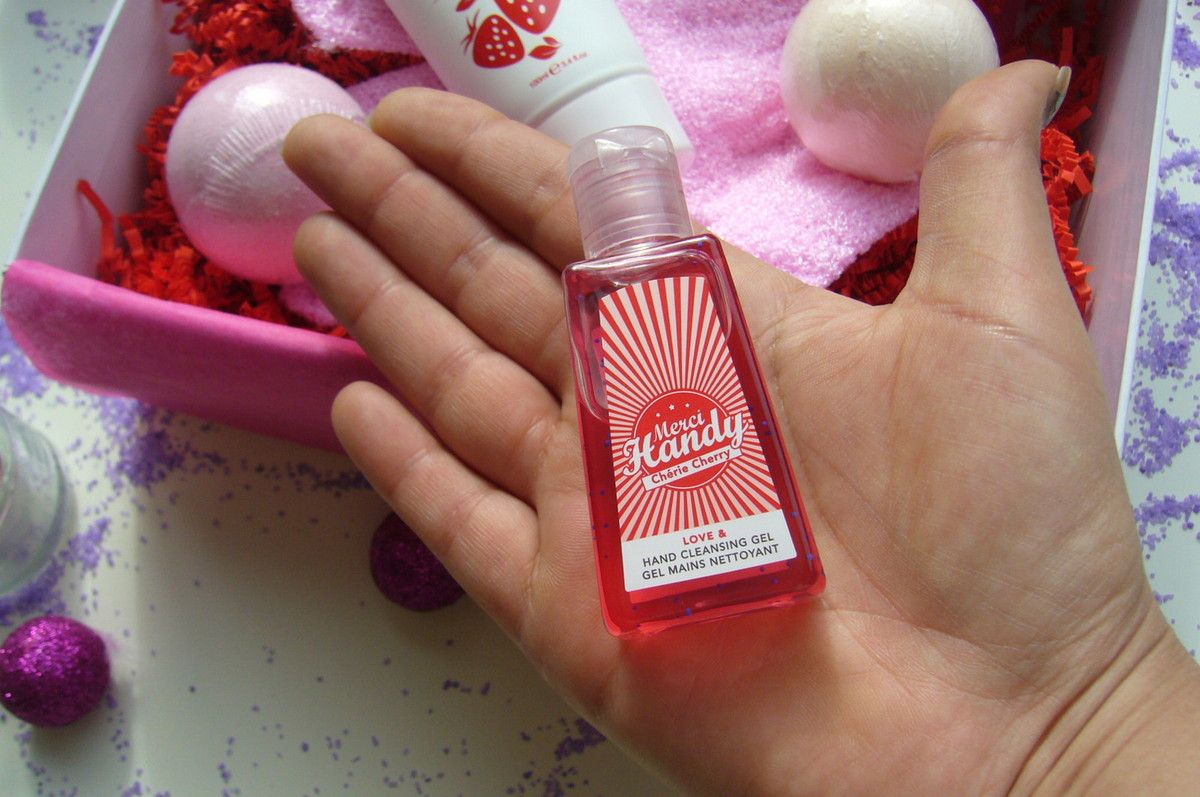 A l'intérieur un gel mains nettoyant de la marque Merci Handy !!!! Hannnnn je suis trop fan de cette marque ! il vous laisse les mains douces et délicieusement parfumées avec ces perles émollientes bleues. Avec son format nomade, je vais pouvoir l'emporter partout, il rentre dans mes poches, mon sac, fini l'odeur médicale qui pique au nez !!! Un doux parfum de cerise le remplace ! conseil d'utilisation de la marque : prélevez une noisette et frictionnez vos mains pendant 30 secondes comme si vous veniez de gagner à la tombola !!!!!! ( en plus ils ont de l'humour !!! allez Merci Handy si je gagne à la tombola je vous achète tout votre stock !!! promis.....!!!! mieux je vous rachète votre licorne ! ) Valeur 3 €