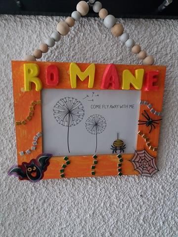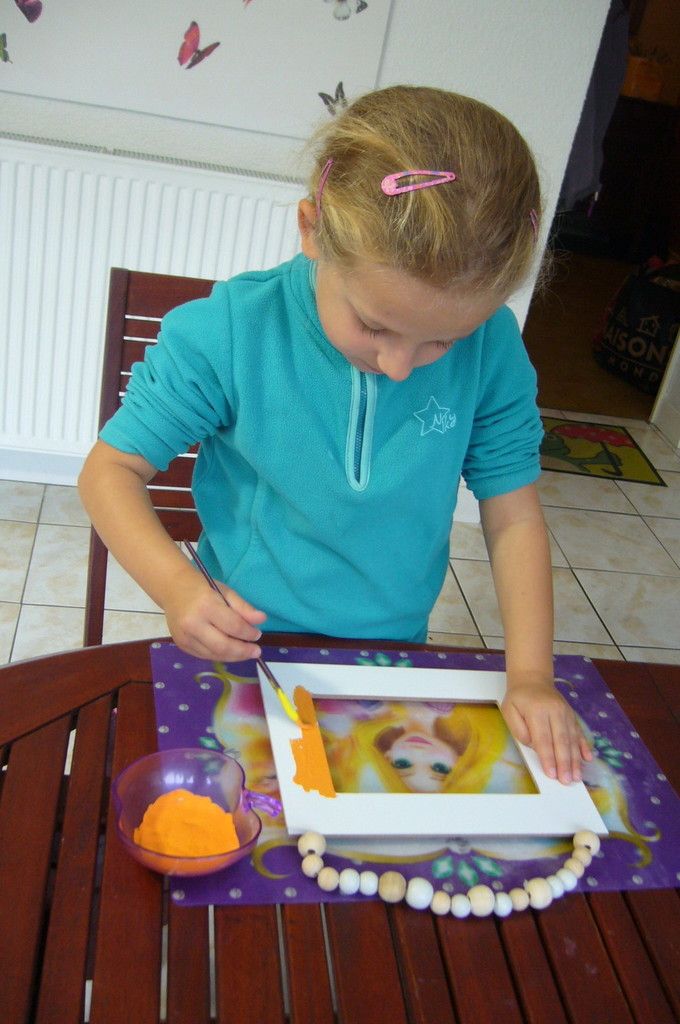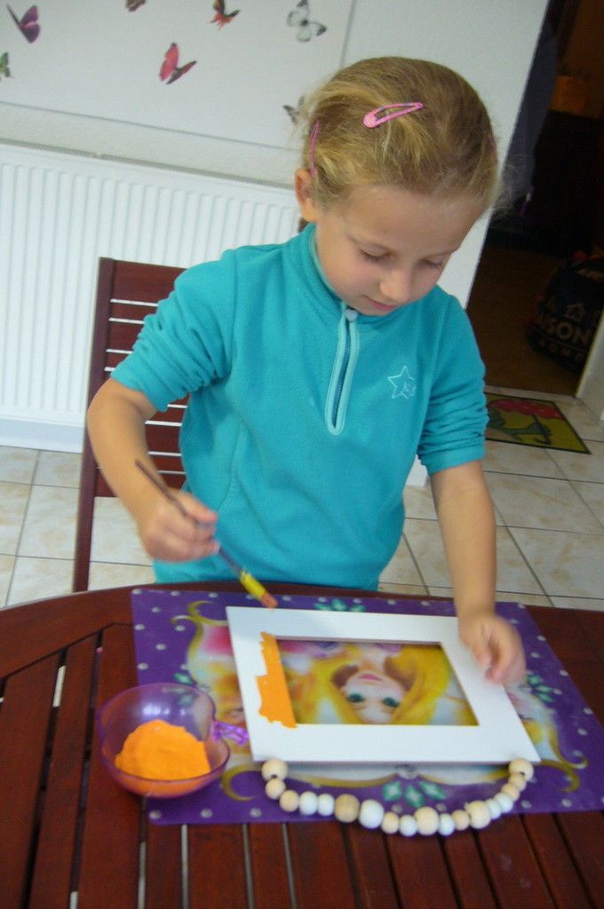 Nous attendons sagement que cela sèche , mais comme c'est un plâtre à séchage rapide, nous allons pouvoir continuer très vite ! Pendant ce temps poupette peint son cadre en orange, elle veut rester dans les couleurs automnales d'Halloween, ne la contrarions pas lol !