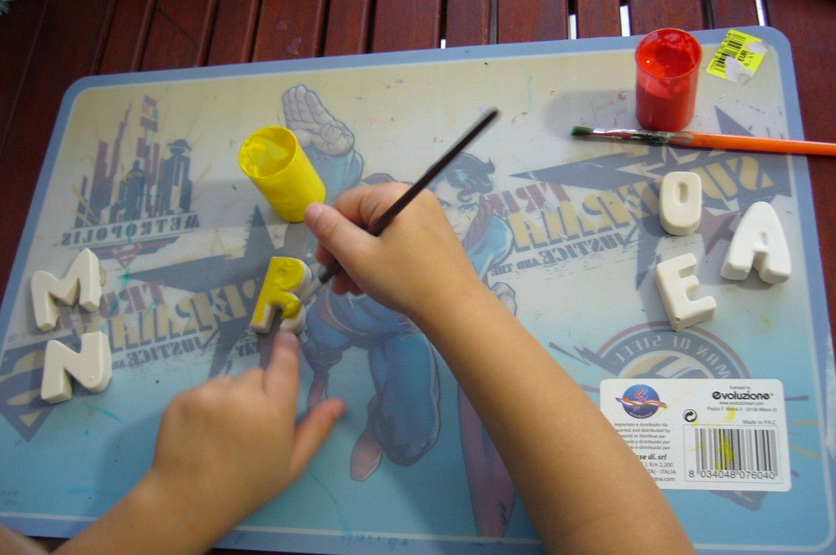 Place à la peinture des lettres en plâtre maintenant, concentration maximum pour poupette ! Nous avons choisi une alternance de rouge et jaune.